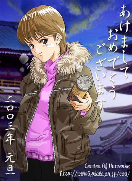 「初詣」 2003年 あけましておめでとうございます。 着物はみなさん描いてることだろうと思って、 初詣と初日の出を兼ねたというありそうなシチュエーション。 前夜からの除夜の鐘も突いたとオールナイトのイベントです。