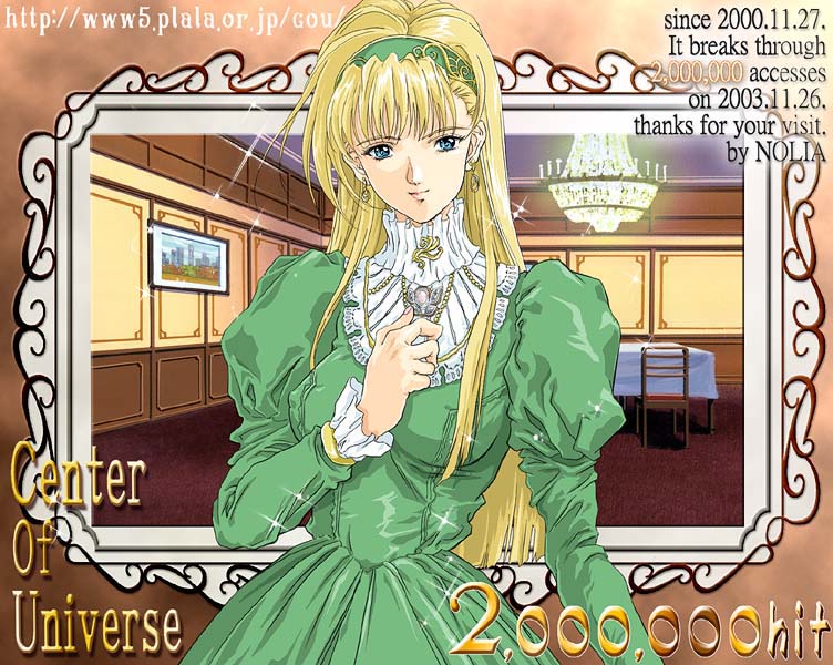 2000年の11月27日に開設。 それよりちょうど3年で200万ものアクセスを重ねることが出来ました。 身辺にそれなりに変化もあり、ここの所サイトの方は 少しおざなりになってますが、このサイトは私NOLIAの原点。 これからも、大事に頑張っていきたいと思っていますので どうぞよろしくお願いします。 絵は中世末期16世紀を舞台にした ソウルキャリバーの二次創作同人ソフトを製作中で最近世界史な気分で こういう地味な衣装は中々描く機会がなくって…。