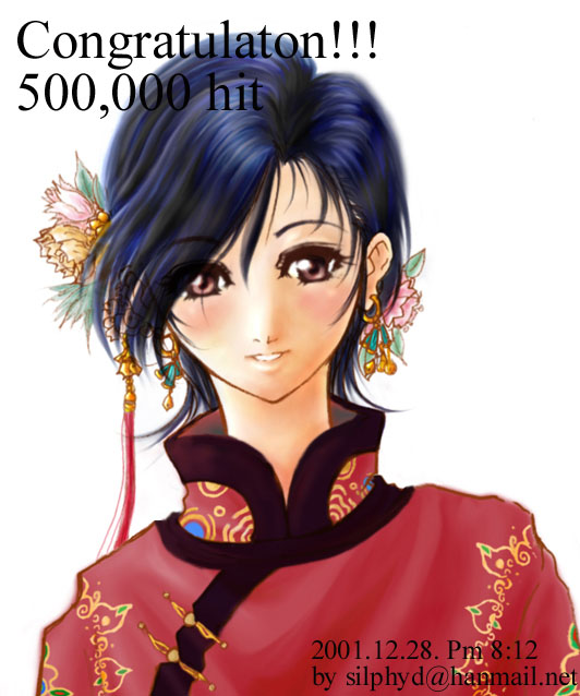 韓国の方…silphydさんより 50万アクセス突破のお祝いの絵いただきました。 う〜んなんか本場の迫力といいますか、 問答無用の説得力がありますね。 繊細な髪の毛、華奢な装身具の飾り細工… 薄く染めた頬のつぶらで大きな瞳に吸い込まれそうです。 お祝いに相応しい華やかなCGありがとうございました。