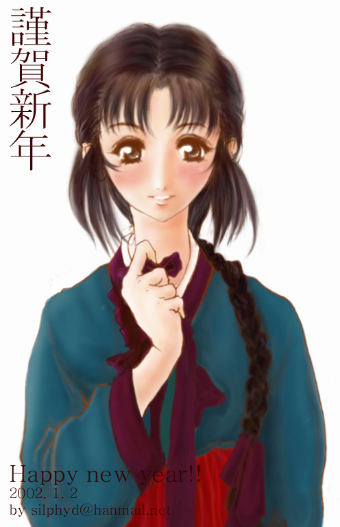 またまた韓国のsliphydさんより頂きました。 謹賀新年(向こうはなんて云うんでしょう)、年賀状です。 紅の袴は万国共通祝賀の色か、上のぐんじょう色(?)の色使いは やはりお国柄を感じさせてくれます。 絵に添えてあった手紙に急ぎの故の怠けを勘弁とありましたが、 そんなこと無いです。表情と手元はばっちり決まってると思います。 その年賀にあわせてという気持ちが嬉しいものです。 (クリスマスはちゃんとかなり事前に頂きましたし) ありがとうございました。