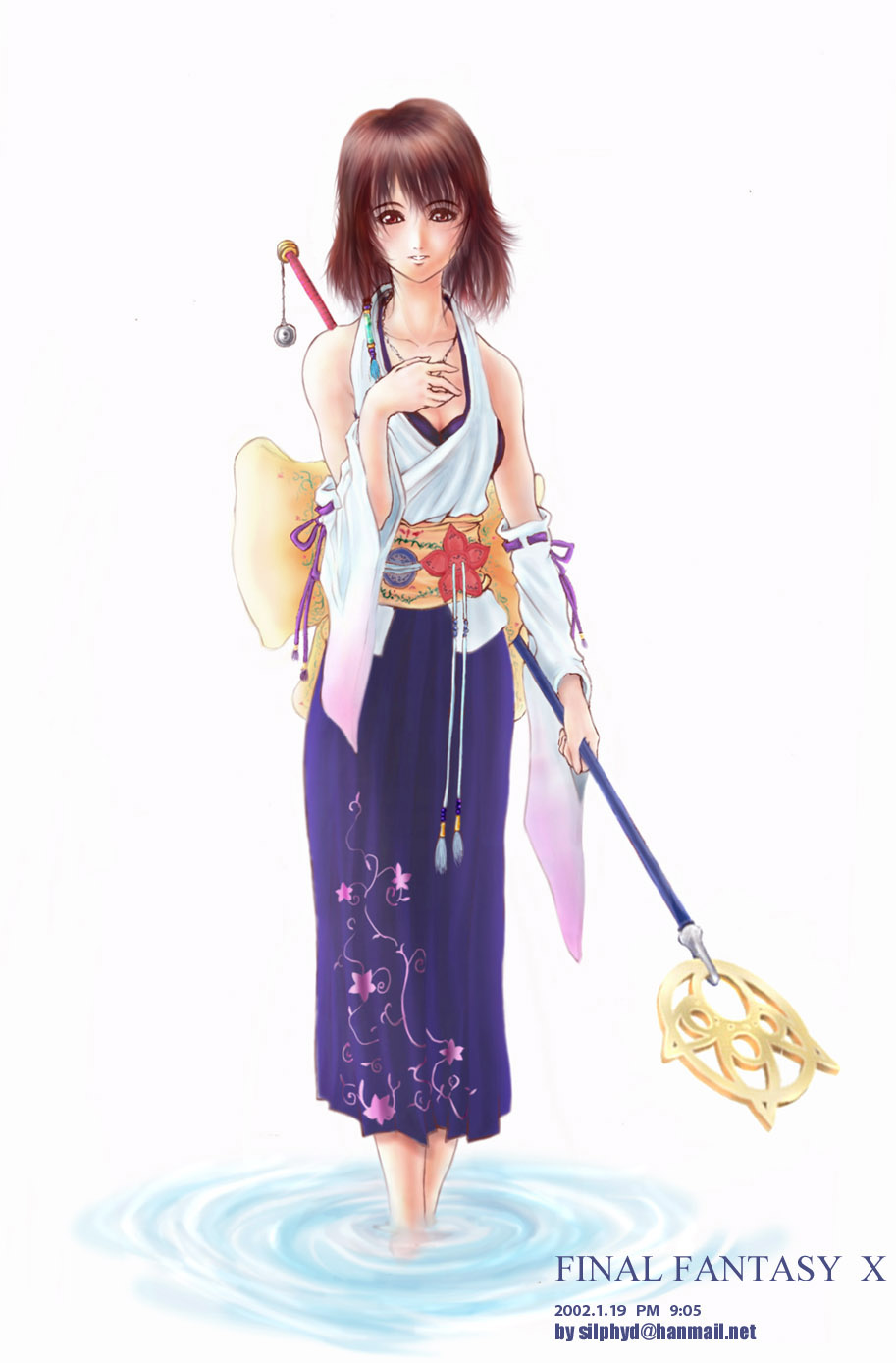 韓国の方silphydさんより プレステ2の2001発売本数No,1、先日インターナショナル版も 発表されたというファイナルファンタジー]より ヒロインの召喚士ユウナのCGいたたきました。 表情もさることながらその柔らかな着物の雰囲気、 それでいてしっかりと立体をとらえている杖の先など 本当に丁寧な仕事振りの絵となっています。 ちょうどこの時期って事はインターナショナル版をプレイしたのかな。
