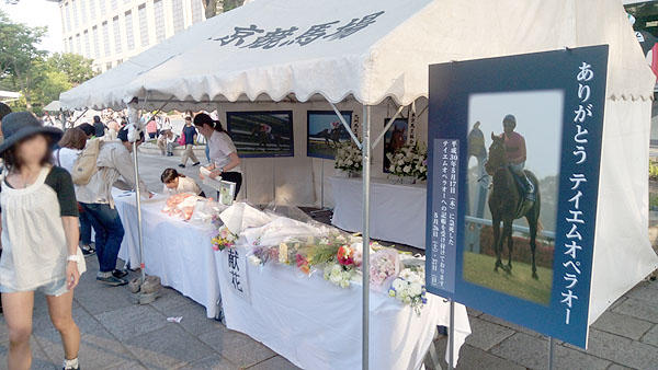 5/17に22歳で急死したG1・7勝馬のテイエムオペラオーの献花・記帳台。
