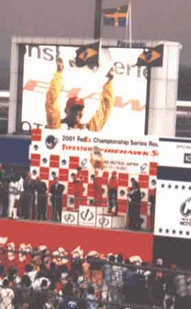 左 やったね 初勝利 ケニー・ブラック なのですが フォードエンジンユーザーなんです。 ホンダは地元で もてぎは ホンダが作ったサーキット また勝てませんでした。 2位のカストロネベスのコメントは 「そーりー ホンダ」で始まりましたね。 (表彰式より) |