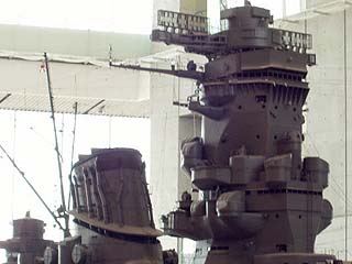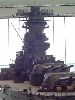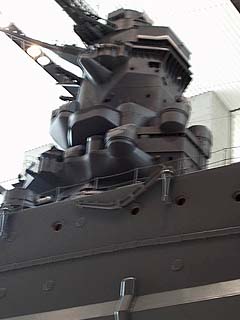 ![]() 艦橋最上部は海面から45m エレベーターもあります。 主砲の最大射程は40km。それだけの距離を 視覚・光学的に測量する為の巨大な艦橋です。 |