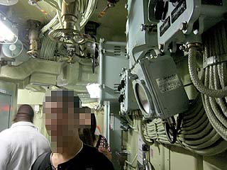 ![]() 潜水艦ブリッジの高さまでは 建物内の展示物。 機雷除去の平和活動をアピール。 潜望鏡は案外小さい。 |