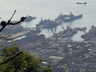 ![]() 港をアップで。 護衛艦と輸送艦が停泊中。 |