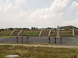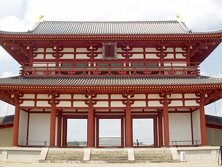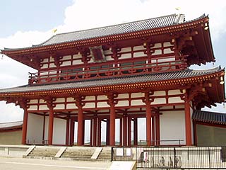 ![]() 炎天下の中、近鉄尼ヶ辻駅から1.5kmほど歩いて 奈良の都、平城京跡へ。 復元された南大門の朱雀門がそびえ立つ。 |