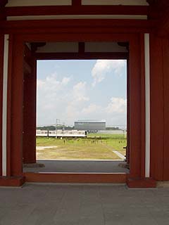 ![]() 門の向こうを電車が走る。何かシュール。 その向こうでは第一大極殿の復元工事中。 |