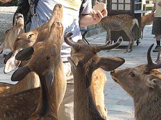 ![]() 奈良の神聖なる鹿は怖い。 屋台のお店にあるのはつまみ食いしないのね。 客が立つと注視し、売れたとなると殺到してきます。 |
