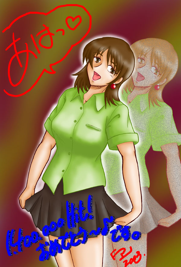「趣味的電影空間」のアシッドさんよりいただいた 140万ヒット祝いのCGです。 萌黄色のシャツが春も間近の季節柄でしょうか。 (バックは秋(?)の水ヨウカンみたいだけど) 何はともあれ、ありがとうございました。