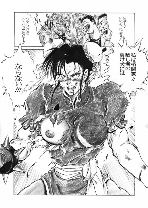 神崎将臣の漫画「ストリートファイターII」のいわゆる妄想具現ですね。 連載誌の方では出てたという春麗の乳首を 改造ではなくて、自分で新たにコマを描き下ろしてみましたって いう悶々中学生なオナニー絵です。はい。 ちなみに単行本では、描き文字の!!で見事、隠されてます。 (この前の鉤爪で引き裂いたってシーンだけど…)