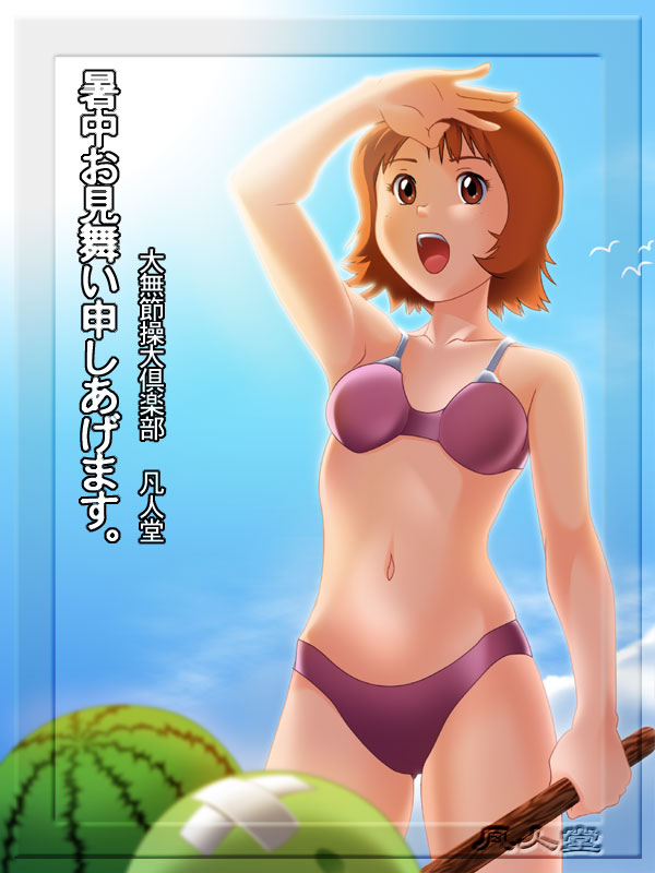 「大無節操大倶楽部」のGalantさんよりmobさん作の暑中見舞いいただきました。 おばさん臭いスカーフの軍服はきてませんが ファーストガンダムのフラウ・ボウです。 なんか隣りの幼馴染な印象の幼げなフラウです。 ばってんバンソコのスイカには縞模様が無いんですけど… マスコットロボットの黄色がデフォで ピンクが最新ガンダムSEEDの流行のようですが ハロ? ありがとうございました。