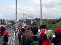 | 10/8(日)決勝のこの日はまた早起きして 昨日より前の電車で、また歩きで鈴鹿サーキットへ。 左の写真は後500mくらいか、観覧車が見えます。 ゲート前。なんとなく感じていましたが、 昨日よりずっと人が多い。 翌日「中日スポーツ」(一面はドラゴンズのマジック2だった)で、 16万1千人で鈴鹿最多と言ってましたが、多分嘘。 消防法の関係でホントのコトは言えなかったかと。 昨日の予選の14万人の1.4、5倍はいたよ、人ひとヒト。 |