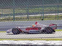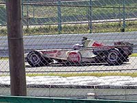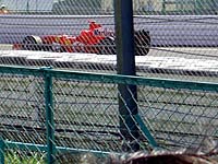 左は鈴鹿最後の皇帝シューマッハ。 ドライバーはヘルメットの色で識別します。 これは真っ赤なので黄色のマッサじゃなくてシューマッハ。 ドライバーズ・パレードも上手く撮れなかった。 この後、マシンのまわりに人がワラワラと溢れる スタート直前のおなじみの光景に。 |