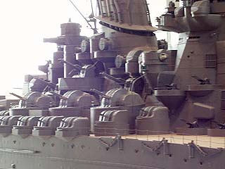 ![]() 艦橋最上部は海面から45m エレベーターもあります。 主砲の最大射程は40km。それだけの距離を 視覚・光学的に測量する為の巨大な艦橋です。 |