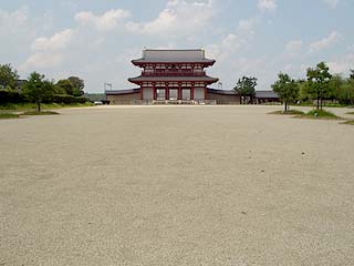 ![]() 炎天下の中、近鉄尼ヶ辻駅から1.5kmほど歩いて 奈良の都、平城京跡へ。 復元された南大門の朱雀門がそびえ立つ。 |